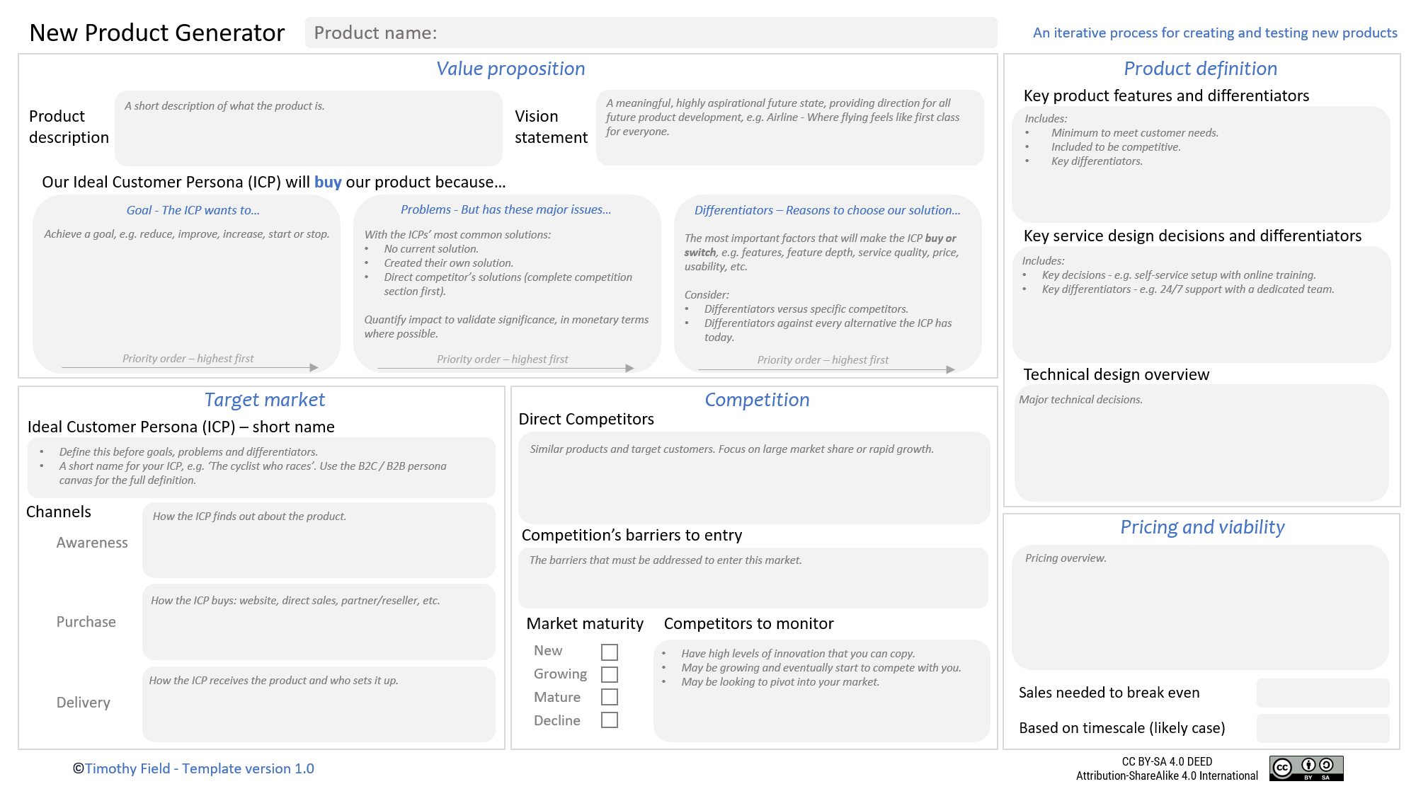 This innovation canvas helps you create and optimise new products and high-risk features. After this, use CPF to improve your new product.