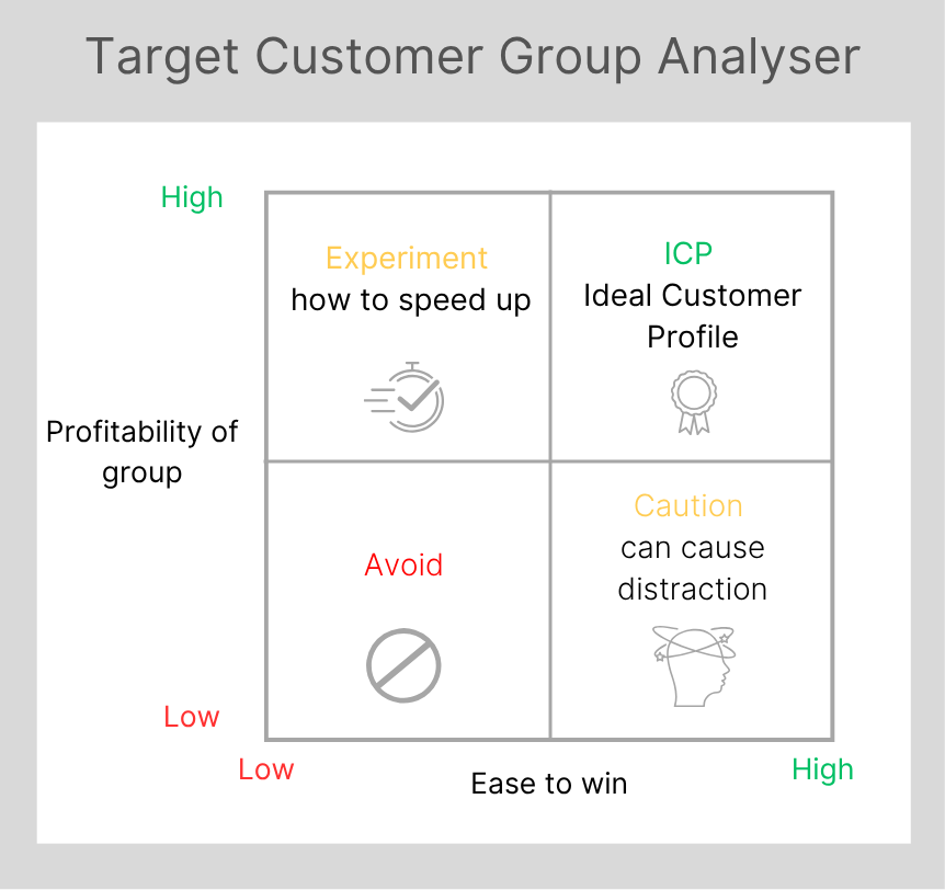 An ICP is the customer group you should target to maximise success/profit as shown in the grid below. They are used in marketing, sales and product development. The profitability represents the entire group, for example: